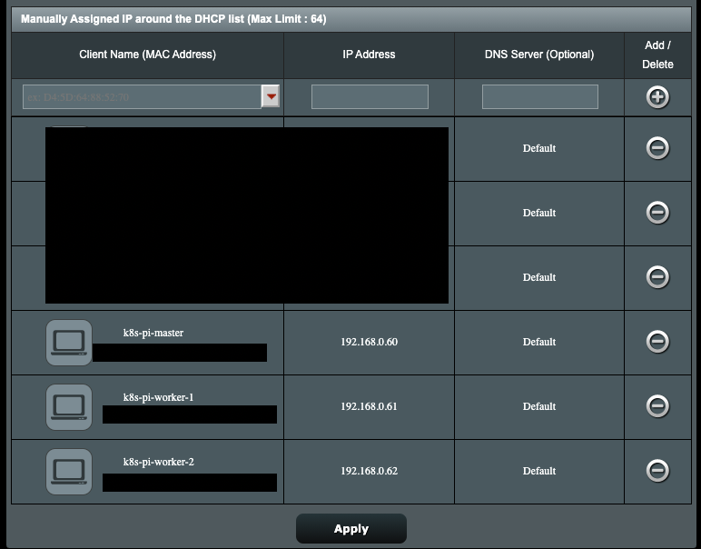 There’s a lot of good guides for setting up Raspberry Pis with Ubuntu. I used the official Raspberry Pi Imager to flash the OS onto an SD card. I needed ssh access to the cluster, so I made sure to add a file called ssh in the system-boot directory while I still had access to the SD card. Once the power supplies and networking cables were connected, I assigned a static IP address to each node using my router. Because I have an ASUS router, I was able to do it through the GUI. Your milage may vary.
